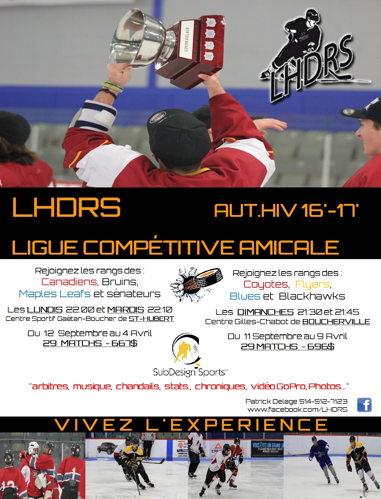 LHDRS - Lundi - St-Hubert - LUNDI ET MARDI EN ALTERNANCE | Compétitif | 12 sept 2016 | Centre sportif Gaétan-Boucher | 22:00 - 23:25 | 29 | 667.00 $ |