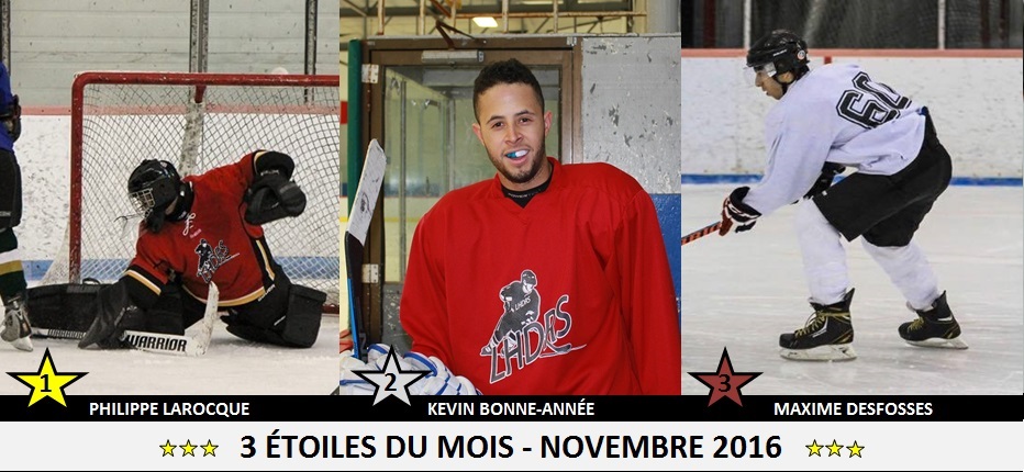 3ème étoile : Maxime Desfosses. La persévérance est souvent synonyme de réussite. Avec 8 participations au cours du mois de Novembre, Maxime a été élu 1 fois la 1ère étoile, 2 fois la 2ème et enfin 1 fois le 3ème étoile. il a accumulé 11 buts et 12 passes pour un total de 23 points soit une moyenne de 2.87 points par matchs mais fait important il n'a reçu AUCUNE punitions.