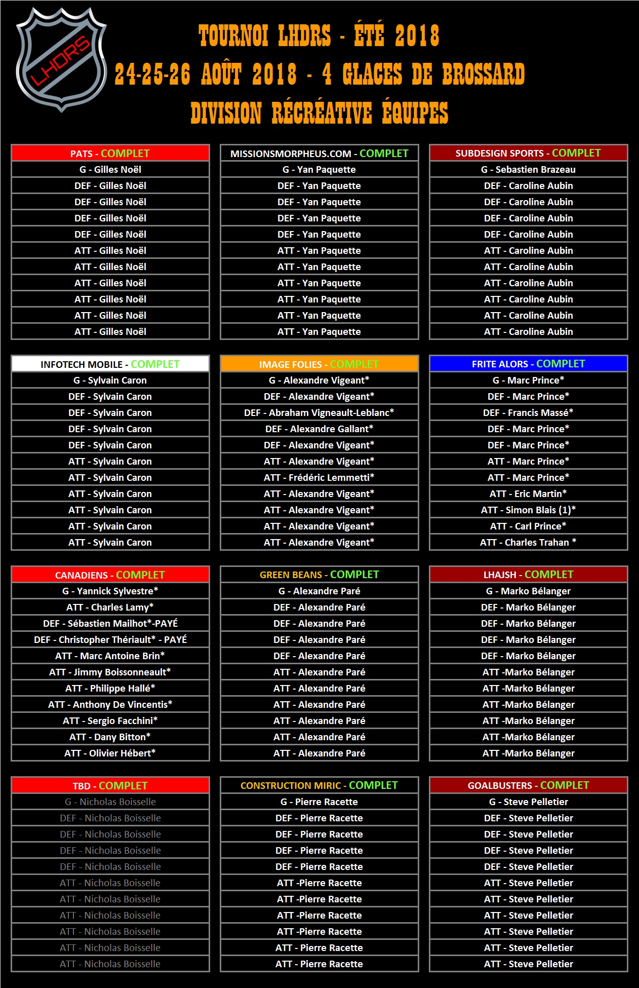 C'est avec un immense plaisir que je tenais à vous annoncer que nous avons déjà 46 équipes d'inscrites pour le tournoi qui aura lieu aux 4 Glaces de Brossard les 24, 25 et 26 Août 2018 pour une 5ème édition.